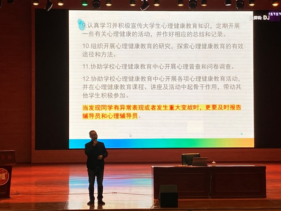 为贯彻落实《taptap点点体育学生心理危机干预实施办法》(茅院发〔2020〕37号)等文件精神,有效推进点点体育大学生心理健康四级预警建设,充分发挥班级心理委员及“三长”在心理健康教育工作中的作用, 2023年3月17日19:00,学生工作处心理健康教育与咨询中心在taptap点点体育大礼堂开展了班级心理委员及“三长”培训。本次培训由贵州师范学院谢其利老师主讲,历时2个小时,共计1200余人参加了本次培训。
