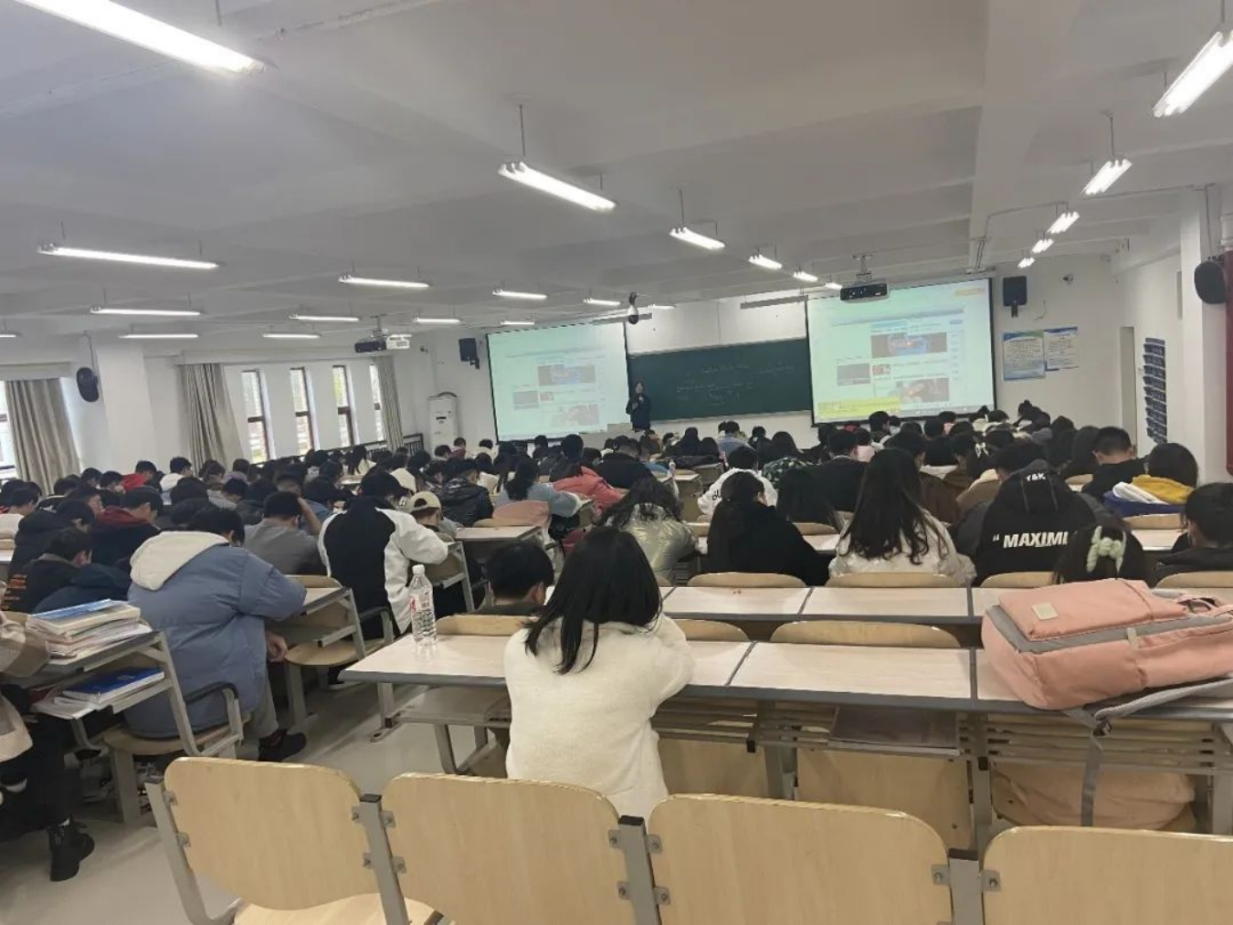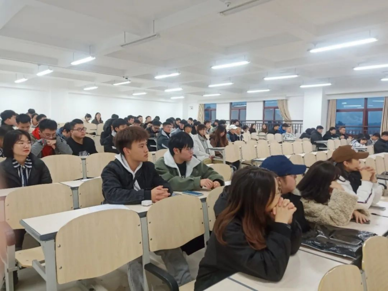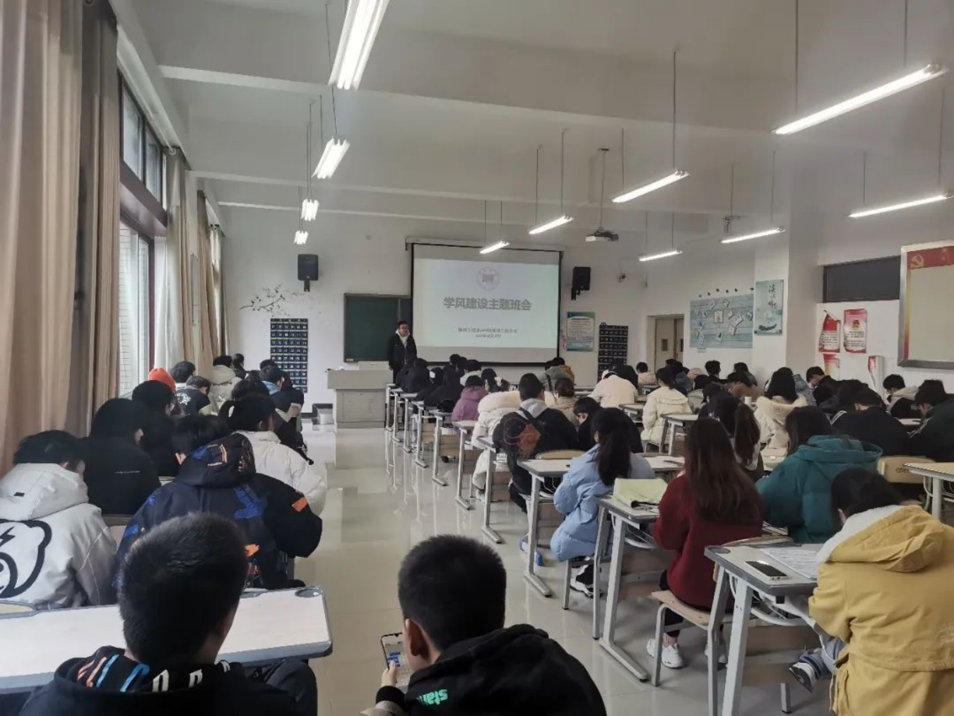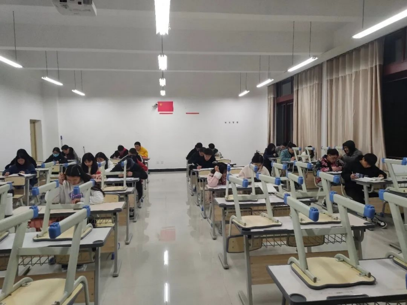 为了使同学们合理安排时间、有效地做好学习规划,在辅导员老师引导下,同学们在教室上晚自习。遵守自习纪律、认真学习、积极复习备考。