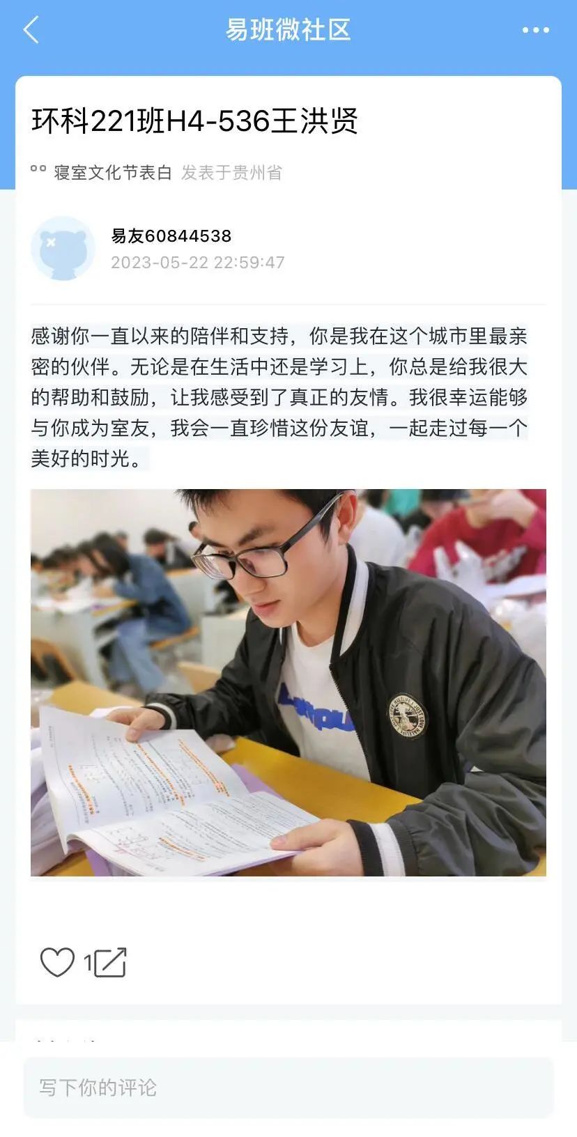 “我的好室友”板块中,大家仿佛打开了记忆的闸门,仔细回忆了相处的点点滴滴,在稀松平常中发现身边美好,在回首往事中搜寻动人瞬间,重启内心珍藏的感动,在易班app尽情向室友表白,用真挚细腻的文字记录下了一起经历的美好和当时的心情。有对初见时顶着烈日陪伴报道的室友的感谢,对同是室友又同一天生日的缘分感叹,也有同在异乡真情陪伴彼此的珍视,还有对优秀室友的肯定和赞美……