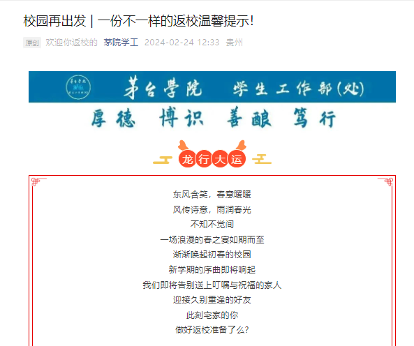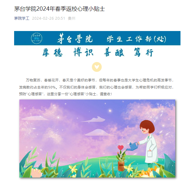 针对全体学生,持续强化返校安全、心理健康、传染病防治等重点领域宣传教育,结合春季学期开学时间节点,通过茅院学工公众号发布《校园再出发 一份不一样的返校温馨提示!》《taptap点点体育2024年春季返校心理小贴士》《春季开学心理调试》《新学期,新气象,共防结核守健康--贵州疾控致学生及家长的一封信》等文章,提醒学生密切关注宿舍用电、自身心理健康及传染病预防等安全知识,帮助学生提升安全防范意识,加强自我保护能力。