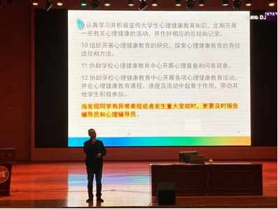 本次培训主题为大学生心理危机干预早期征兆识别及应对,具体包括心理委员及“三长”的角色定位及工作职责、心理健康与心理疾病状态的表现、大学生常见心理障碍及症状表现、非自杀性自伤行为的心理机制、干预以及自杀的预警信号等内容,谢老师在讲授过程中穿插丰富的咨询案例,增进了同学们对大学生常见心理问题症状的了解和识别。