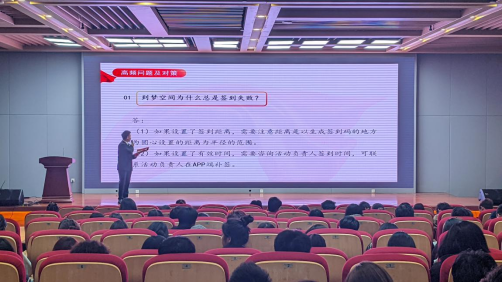 会议现场,王开帅同学带领学生骨干们进行了“到梦空间”app系统使用指南的学习,对发布活动的相关事务进行教学指导,并分别对校园活动发布、活动管理、注意事项及高频问题应对策略等进行了详细讲解。他指出第二课堂作为第一课堂的延伸和补充,其学生骨干的工作能力是保障各项活动有序开展的重要基础,进一步深化了同学们对第二课堂的认识和了解。