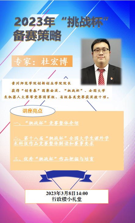 为更好地备战2023年“挑战杯”全国大学生课外学术科技作品竞赛,让参赛师生更全面、更深入了解“挑战杯”竞赛,提高备赛的针对性,3月8日下午,校团委于行政楼小礼堂举办2023年“挑战杯”备赛专题讲座。此次讲座邀请到贵州师范学院创新创业学院院长、“挑战杯”全国优秀指导教师、国赛金奖导师杜宏博老师作为主讲人。