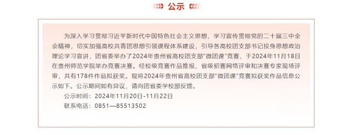 校团委将以此次“微团课”大赛为契机,不断探索团课新形式新路径,优化团课组织形式,丰富团课内容,以线上线下相结合的方式,引导全校青年学子深入学习领会政治理论知识,不断增强坚定不移听党话、跟党走的行动自觉,积极建功新时代,为推动“五育”校园建设贡献更多青春力量。(一审:雍诗琳、罗薇 ,二审: 杨贵鹏,三审: 布如宇)