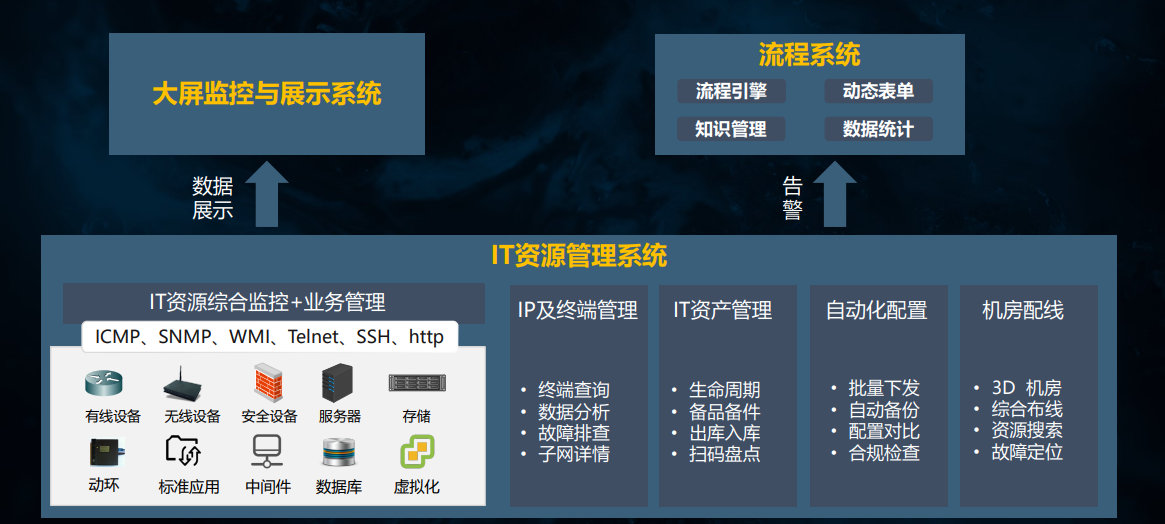 网络智能管理系统不仅能够对多厂商多设备进行统一管理,还能对IP子网、机房及自动化配置、IT资产、流程等进行管理,实现了设备管理信息的集成和整合,也实现了信息的共享和利用,保障了业务系统的正常开展和稳定运行的同时,大大提高了运维工作效率。