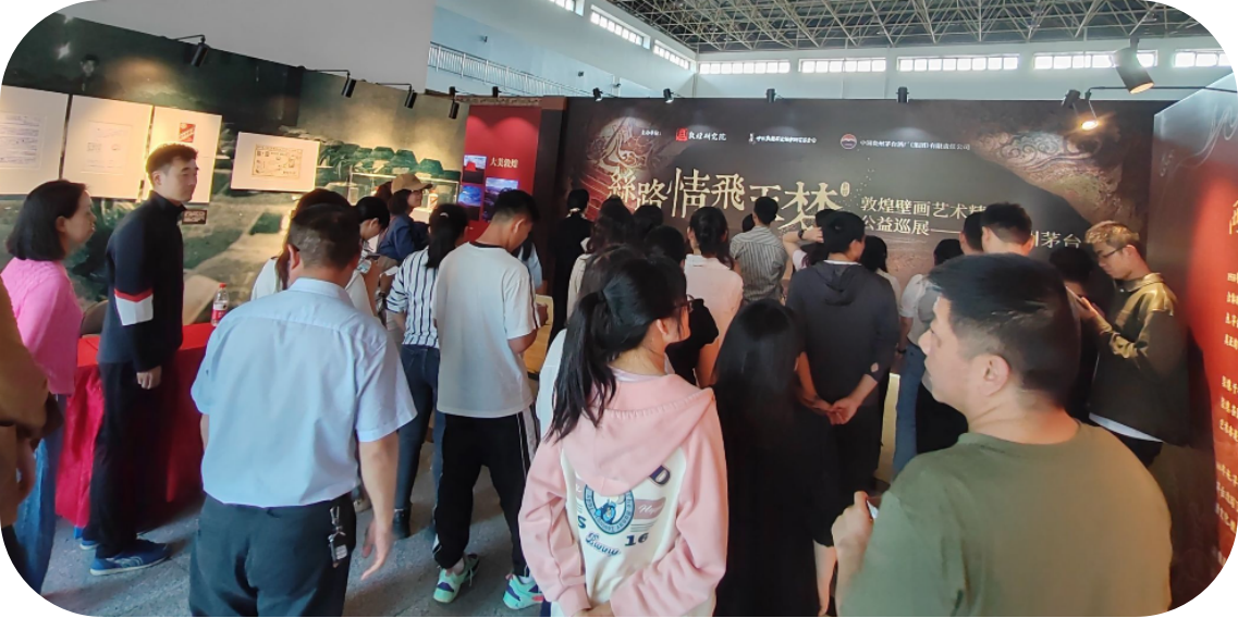 为深入学习领会习近平文化思想,带领大家深刻领悟“两个确立”的重要意义,加强对中华优秀传统文化的了解和传承,提升全体教师的实践能力和艺术审美素养,感悟思想伟力,汲取奋进力量。2024年4月2日下午, 公共基础教学部党支部全体教师前往风雨操场参观敦煌研究院、中国敦煌石窟保护研究基金会与中国贵州茅台酒厂联合举办的“丝路情·飞天梦”敦煌壁画艺术精品工艺展览,开展“赏大美中华艺术,走文化自信之路”主题党日活动。