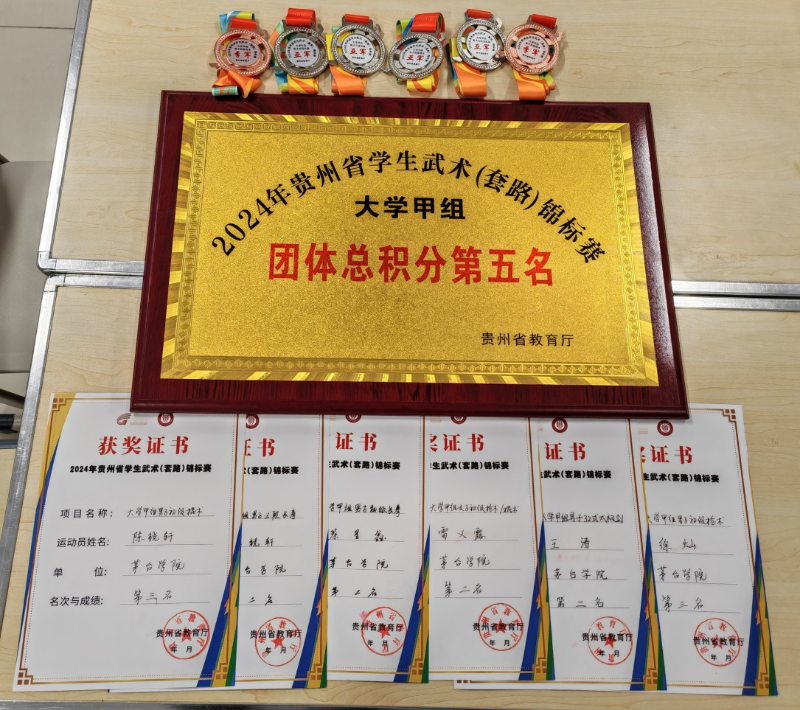 由贵州省教育厅主办的2024年贵州省学生武术(套路)锦标赛,于10月30日-11月1日在贵州大学体育馆举办,来自全省32支代表队、300多名运动员教练员参加了这次武术比赛,点点体育作为大学生甲组(本科组)12支代表队中唯一一支没有体育专业学生的学校,在与体育生的同场竞技中,经过激烈角逐,点点体育运动员取得了优异成绩。