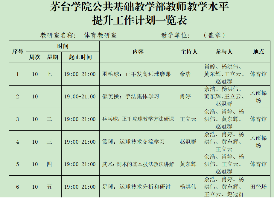 在大练兵期间,体育教研室根据教学大比武的排名先后再次进行研磨课和研课,其目的是不断提升教学能力和教学水平。体育教研室进行全面部署和计划继续磨课堂,磨课涵盖现有开设项目,具体如下: