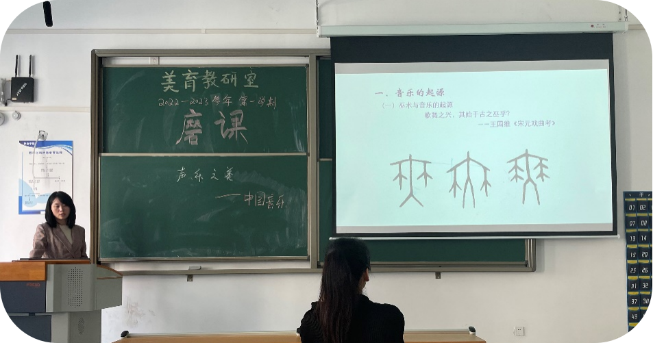 本课程第九章《声乐之美》及第十章《器乐之美》的教学安排为四周,将在第十三个教学周结束。《音乐之美》的内容是最直接能让学生感受艺术之美的手段,结合教研室三位老师的所学专业,教研室计划在十三周付婷婷老师的周二下午课上,由三位老师共同完成一节《音乐之美》的公开课并邀请教师进行观摩。