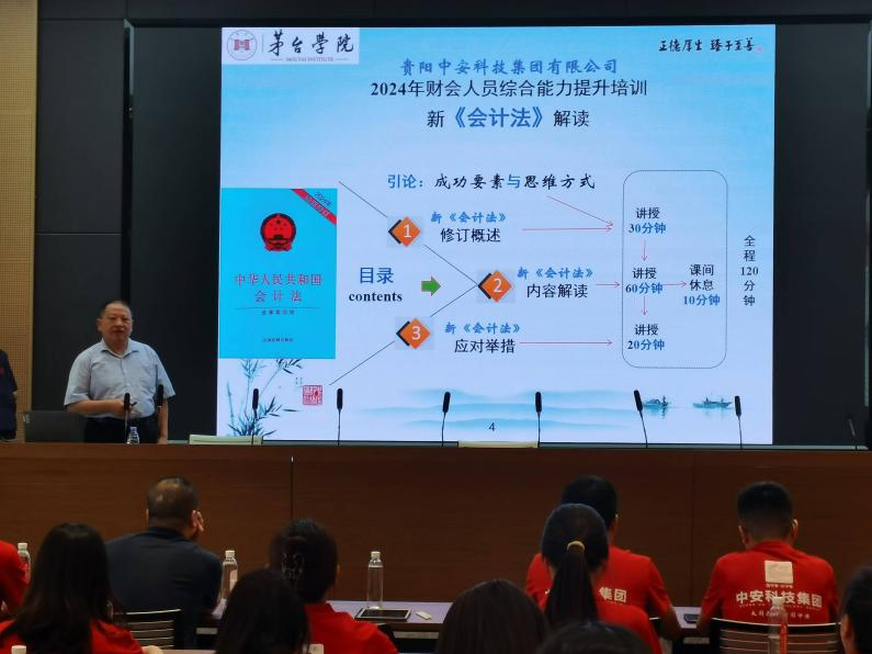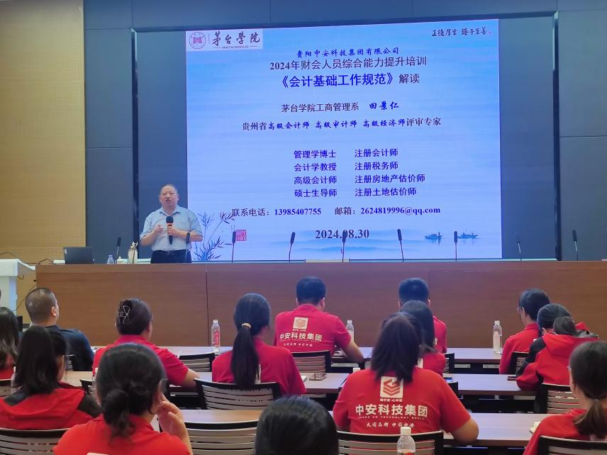 为提高公司财会人员综合能力,增强财会人员风险意识,夯实会计工作基础,2024830日,田景仁教授应邀为贵阳中安科技集团公司30多名财会人员举办新修改中华人民共和国会计法》和《会计基础工作规范》两场专题讲座。