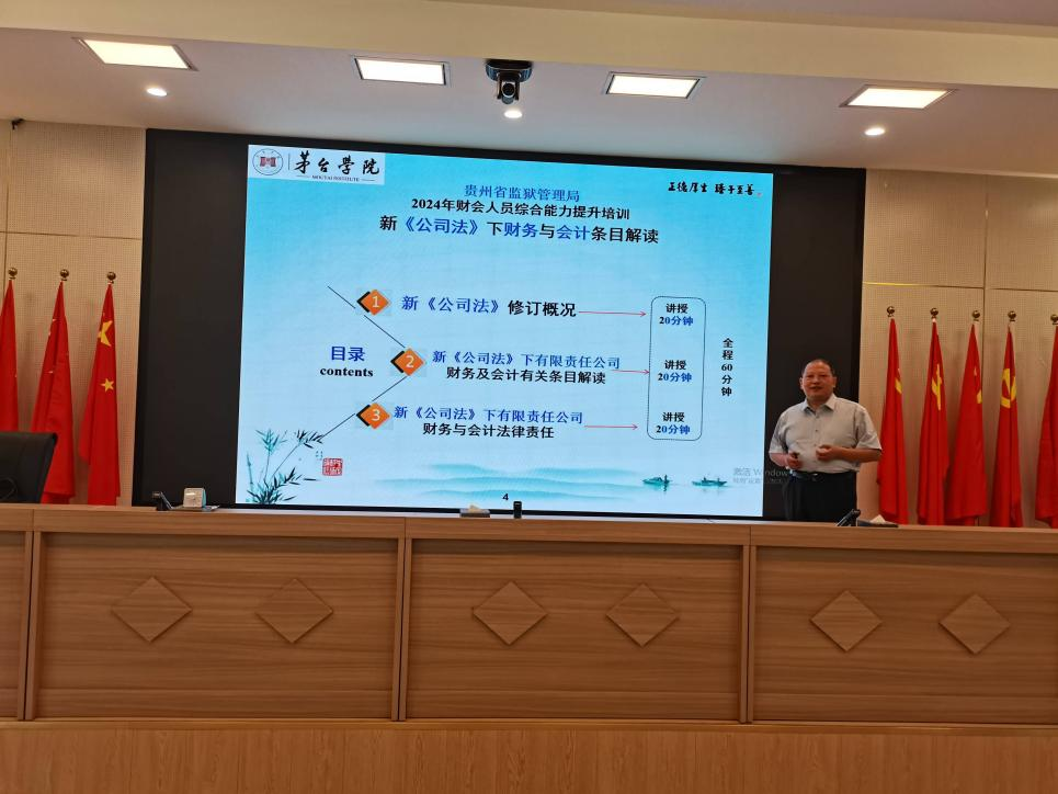 为提升贵州省监狱管理局企业财会人员业务能力,增强财会人员风险意识,9月13日,田景仁教授应邀为贵州省监狱管理局企业90多名财会人员举办新修改的《中华人民共和国会计法》和《中华人民共和国公司法》两场专题解读讲座。