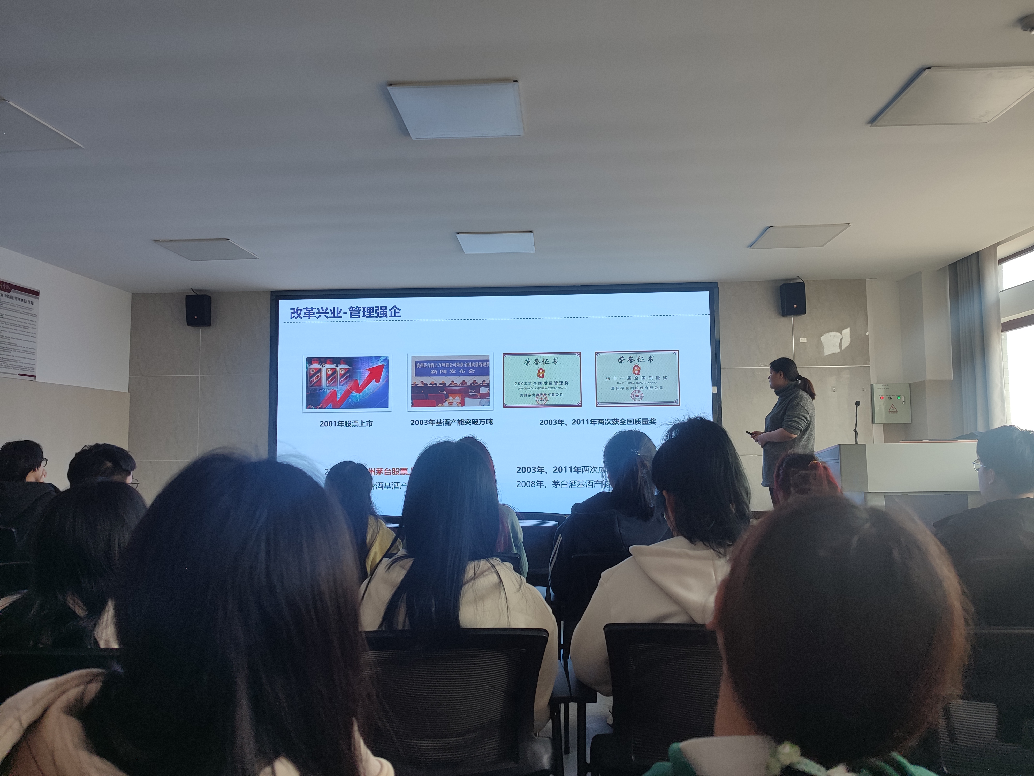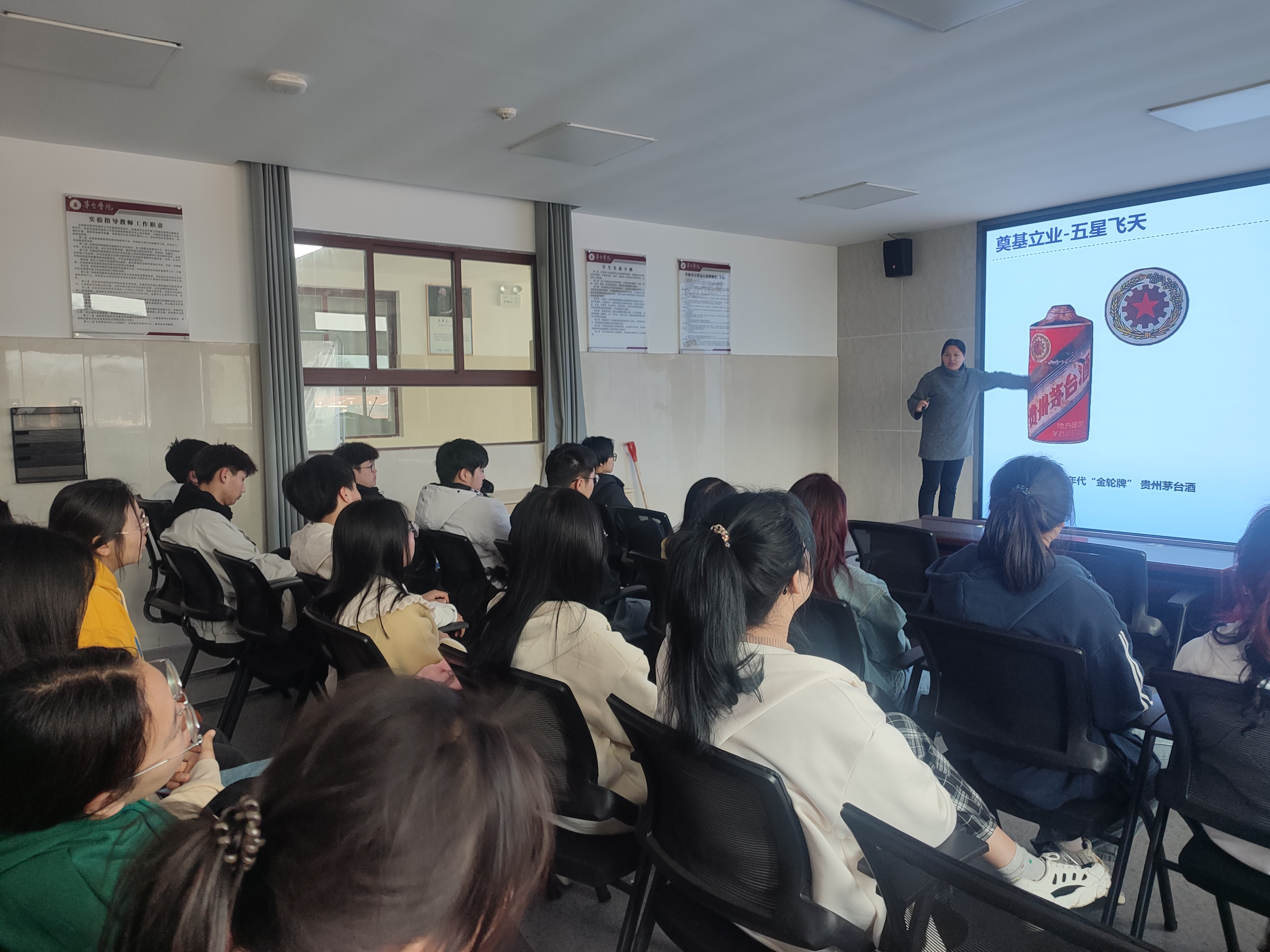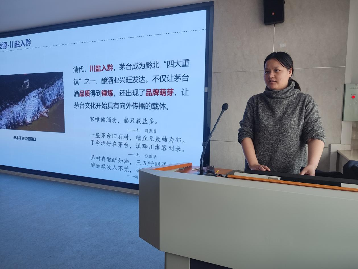 谢文锦副教授讲解了茅台集团的文化发源,讲述了周西成无酒不茅台的故事以及红军赤河饮马、茅台洗尘的红色文化。她围绕茅台集团奠基立业,提产量、优质量的过程,讲述了五星、飞天酒的标志含义和茅台集团严格把控的12987的生产工艺流程。