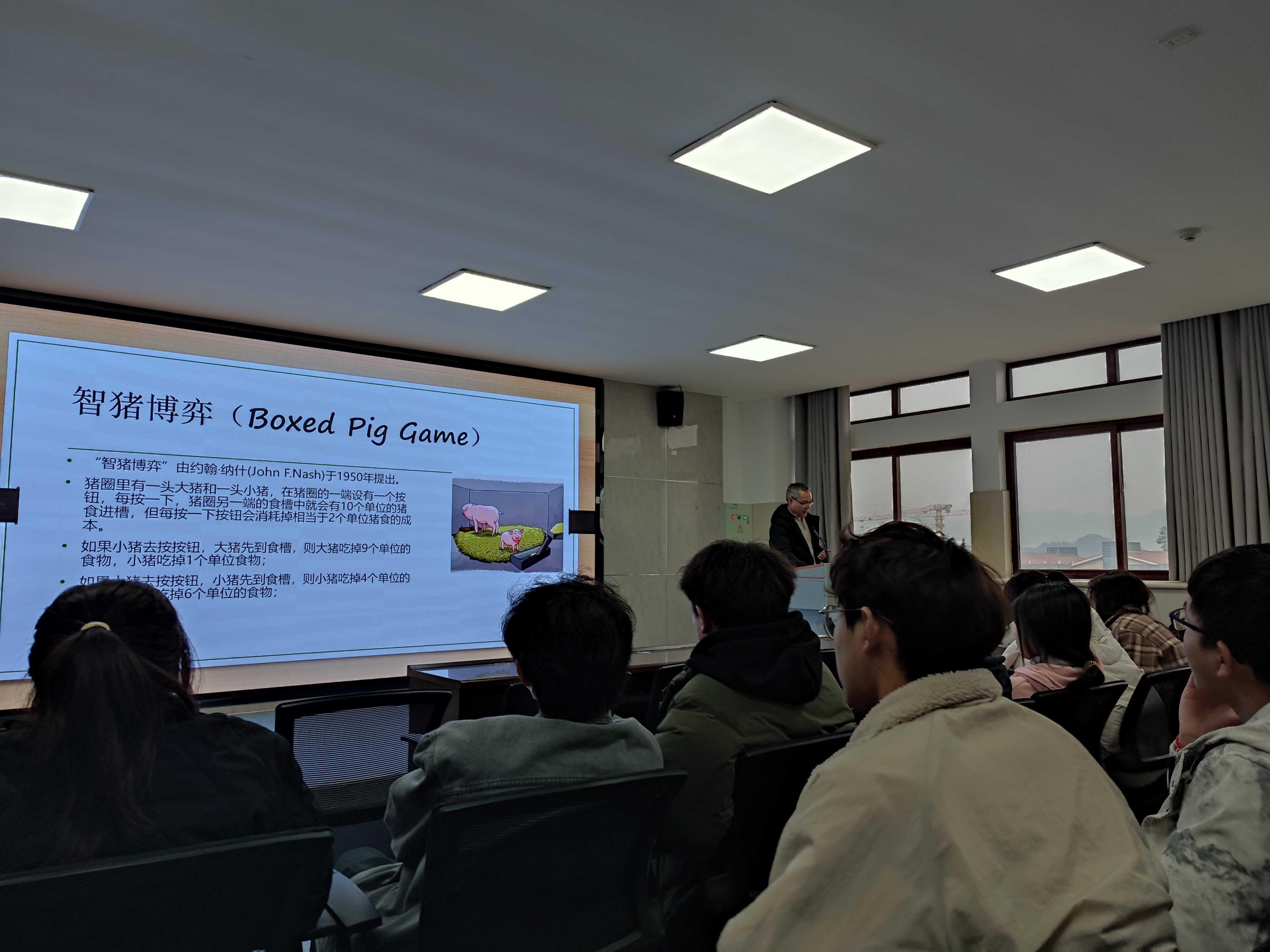 刘敬伟教授通过讲述智猪博弈、海盗之迷等经典的博弈论案例,引起同学们对博弈论在实际生活应用的兴趣和思考点,同学们踊跃发表自己的观点,从这次讲座中加深了对博弈理论的认识。