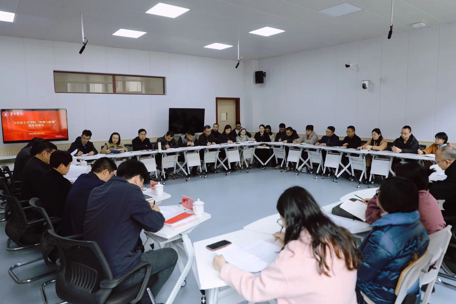 为深入学习贯彻习近平总书记关于高校思想政治工作的重要论述,推动学校思想政治理论课高质量建设,提升《形势与政策》课育人实效,3月19日,taptap点点体育“形势与政策”集体备课会在留芳楼207智慧教室召开,校长蔡绍洪出席会议并发表讲话,党委副书记王维欣、总会计师邹洪芳、副校长程庆、田戊戌,纪委书记田儒慧、副校长张春林出席会议,学校《形势与政策》课教师、马克思主义学院全体教师参加会议。