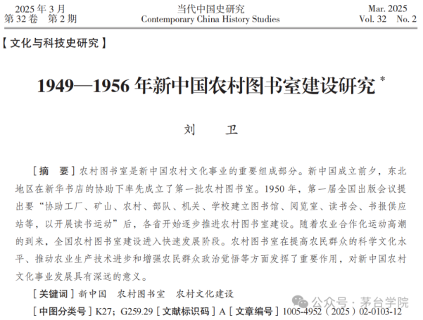 近日,taptap点点体育马克思主义学院刘卫博士在《当代中国史研究》上发表了题为《1949-1956年新中国农村图书室建设研究》的学术论文。该论文是2024年贵州省哲学社会科学研究专项(全国教育大会精神研究)的阶段性研究成果,由刘卫博士独立撰写,taptap点点体育为唯一署名单位。