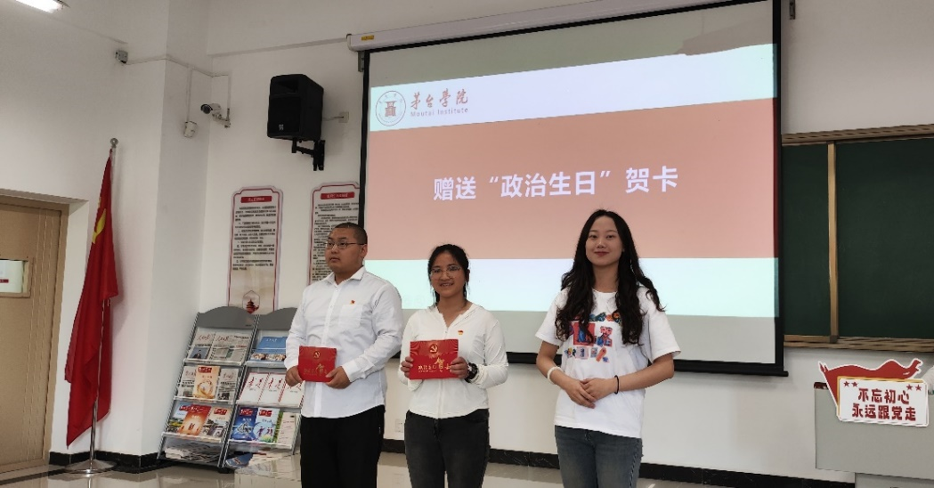 活动为每一位党员都赠送了“政治生日”贺卡,并集体过“政治生日”。酿酒工程系教师党员代表黄颖同志向毕业生党员代表赠送“政治生日”贺卡,希望他们时刻牢记自身身份,注重党性修养,增强党性意识,践行党的宗旨,永葆共产党员的先进本色。