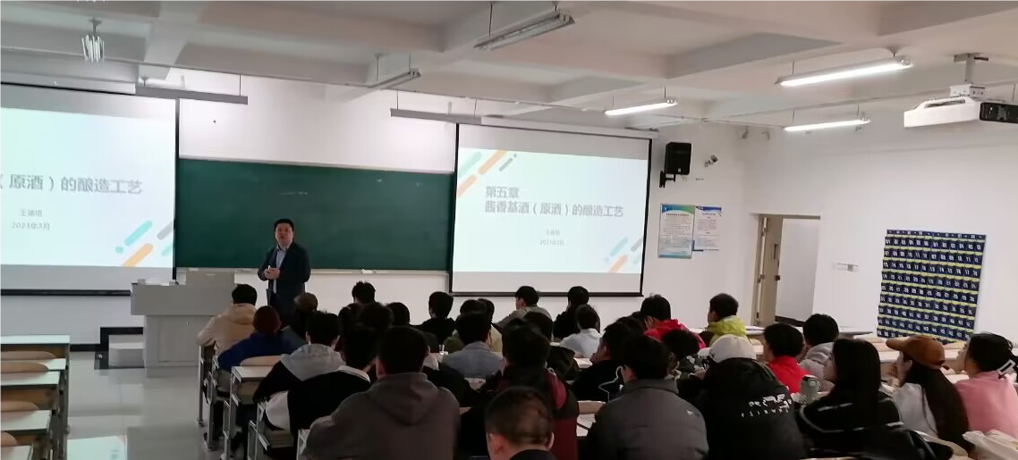 2023年3月31日,贵州茅台酒股份有限公司制酒五车间副主任王德培到校为我系学生授课。围绕大曲酱香型白酒制酒工艺,王主任向同学们详细讲授了制酒工艺的各个环节及工艺中关键参数的控制方法。授课过程中,王主任结合自身多年生产实践经验,生动形象地分享了制酒工艺相关技术。课堂氛围十分热烈,学生掌声不断,纷纷表示深刻感受到了传统酱酒型白酒生产工艺的魅力,也很期待本学期实习能够到制酒车间深入学习,加深理解。