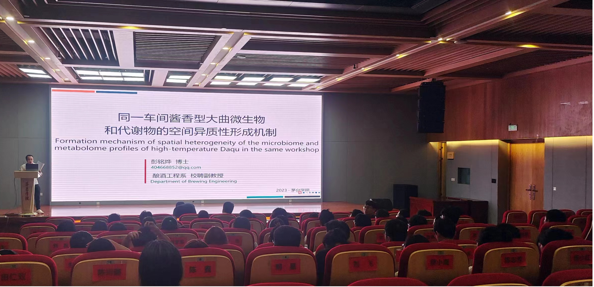 讲座最后,彭铭烨博士还与现场的老师和同学对有关酱香大曲的最新研究进展进行了详细的交流,并耐心的回答了同学们的提问。