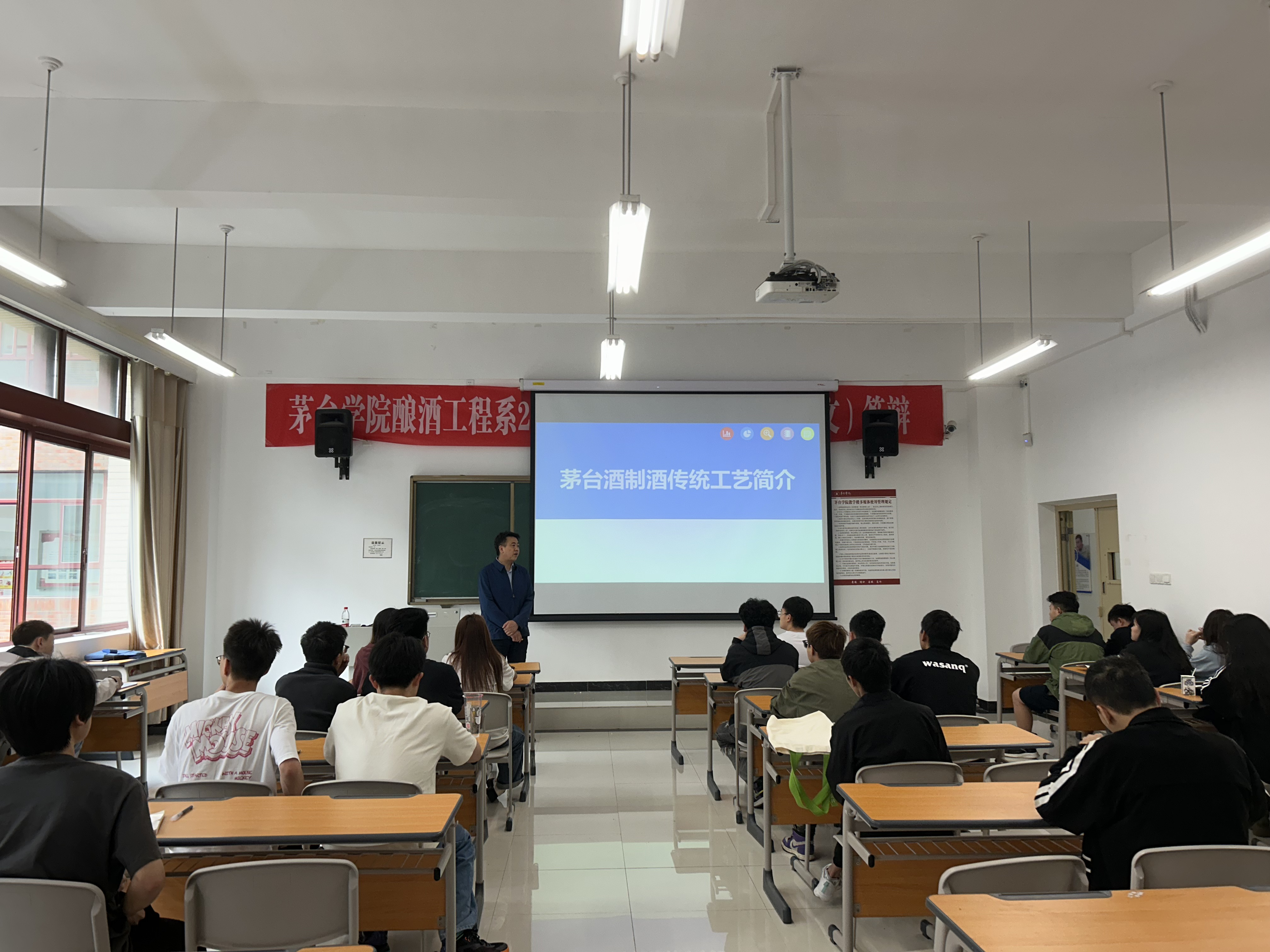 2024年5月17日,贵州茅台股份有限公司制曲二十四车间主任徐松到点点体育为我系学生授课,讲授关于“酱香型白酒生产工艺”的相关内容。徐松主任以丰富的实践经验和深厚的专业知识,详细阐述了酱香型白酒的独特生产工艺和品质特点。他深入浅出地讲解了从原料选择、制曲发酵到蒸馏勾兑的每一个环节,并分享了贵州茅台在传承与创新中取得的长足进步。授课过程中,徐松主任还与学生进行了互动交流,解答了同学们在酿酒技术方面的疑惑。同学们纷纷表示,此次授课不仅拓宽了视野,还加深了对中国传统酿酒文化的理解和尊重。