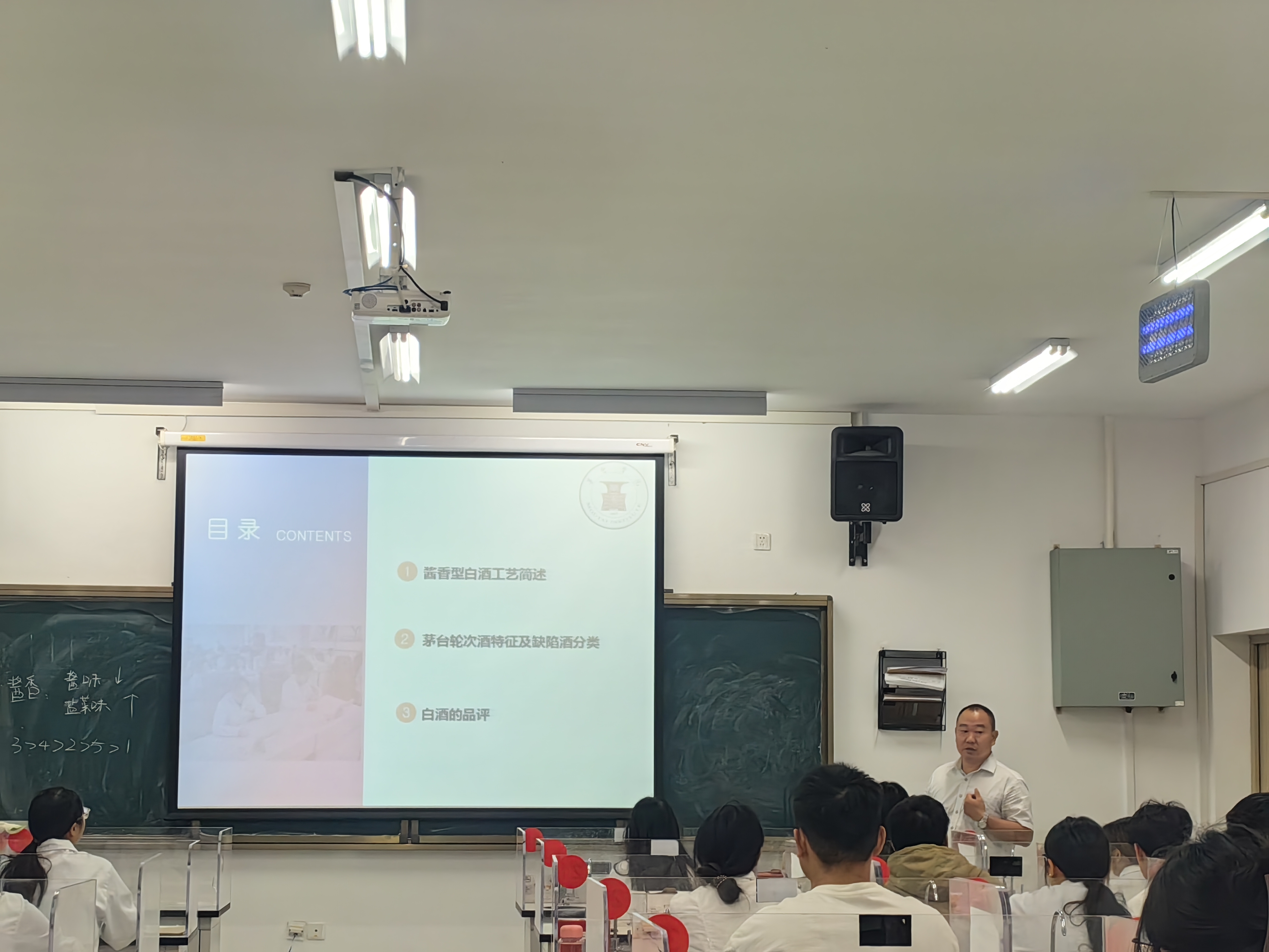 2024年5月21日,贵州茅台股份有限公司制酒二十八车间主任杨喜讯到点点体育为我系学生授课,讲授关于“酱香型白酒轮次基酒品评”的相关内容。杨喜讯主任重点围绕酱香型白酒工艺特点、各轮次基酒的风味特点、轮次基酒品评等内容展开本次授课。在授课的过程中,杨主任结合自身丰富的工作经验,将课堂理论与实际生产紧密结合,让学生理解各轮次基酒特征的形成原因,更好的对酱香轮次基酒感官有清晰的认识,增加学生对白酒品评的兴趣和白酒品评课程的热爱。