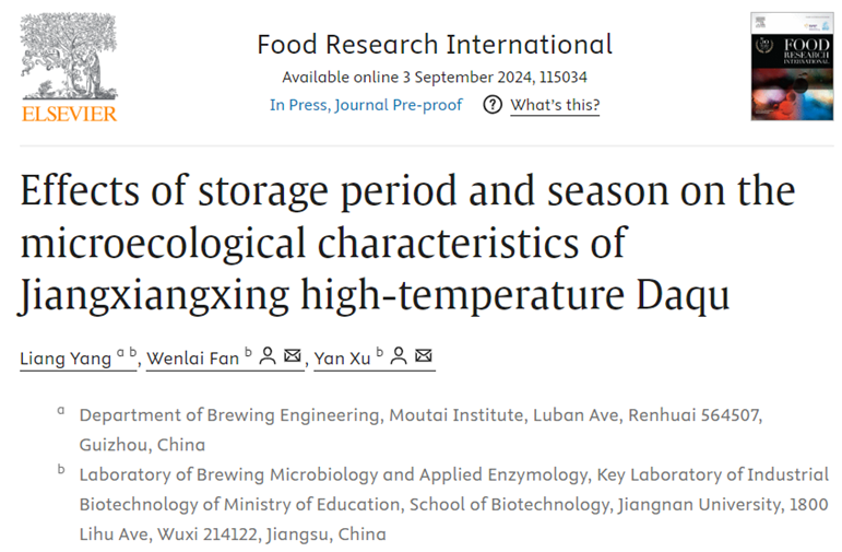 2024年9月,酿酒工程系杨亮博士在国际期刊《Food Research International》(Q1, Top,IF: 7)发表题为“Effects of storage period and season on the microecological characteristics of Jiangxiangxing high-temperature Daqu”的研究性论文。研究获国家自然科学基金(32160553)、贵州省科技计划基础研究项目(黔科合基础-ZK[2021]一般093)、遵义市科技与大数据局(遵市科合HZ字(2023)108号、taptap点点体育高层次人才科研启动经费项目(mygccrc[2022]005))等项目资助。