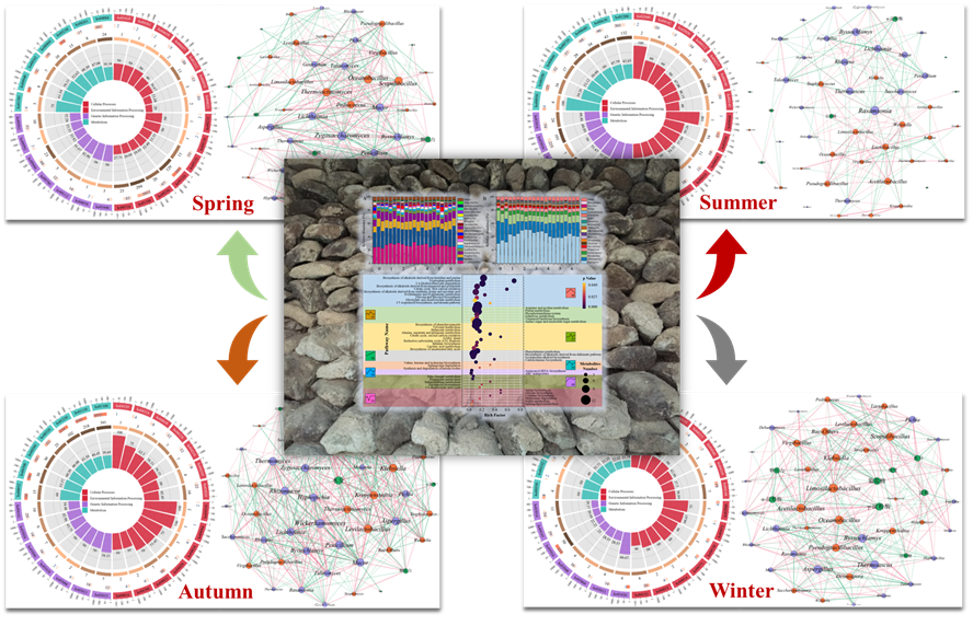针对高温大曲在贮存过程中微生态稳态形成机制不清晰的科学问题及其在不同季节贮存后特性存在差异的现象,本研究采用宏基因组、非靶向代谢组学及宏蛋白质组学技术,解析了贮存期大曲的微生态演替规律,明确了大曲微生物群落对贮存环境的适应机制,以及不同贮存季节大曲微生态特性。研究发现,贮存期间,大曲中的Bacillus、Oceanobacillus、Staphylococcus和Aspergillus等相对丰度显著上升,Kroppenstedtia、Saccharopolyspora、Thermoascus和Thermomyces等相对丰度显著降低。化合物代谢在大曲贮存的前3个月内主要以小分子物质生成为主,后期转向氨基糖代谢,经5个月的贮存可达稳态。在贮存过程中,大曲微生物群落的同质选择(15.57%)及同质扩散(14.86%)组装均远大于发酵过程,且变量选择组装(29.43%)小于发酵过程,贮存过程中大曲微生态的空间分化不显著。在四季大曲中鉴定出的2509种蛋白质中,细菌蛋白质表达量是真菌的1.46倍,且夏曲中微生物的多样性及功能表达最为丰富,而冬曲中微生物群落表现出低多样性和低功能性,季节通过影响Bacillus subtilis、Oceanobacillus iheyensis和Aspergillus nidulans等微生物的功能表达进而影响大曲的功能分化,使得春曲的碳代谢和苯甲酸代谢能力更强、夏曲生物碱和酪氨酸代谢能力强、秋曲倾向于氨基酸合成和淀粉代谢、冬曲肽聚糖合成能力更强。调节贮存期内大曲水分或可减少不同季节温度差异引起的大曲微生态分化。