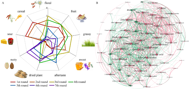 图7 酱香型白酒1-7轮次基酒感官与风味之间联系。