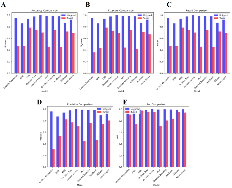 图3 机器学习模型评价指标柱状图,(A)Accuracy;(B)F1_Score;(C)Recall;(D)Precision; (E)Auc,红色代表调参优化后模型,蓝色代表未经过调参优化的模型