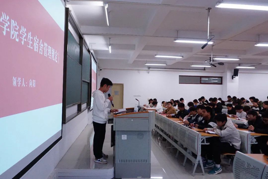 会议伊始,罗粒老师紧扣活动主题,围绕寝室卫生安全,强调寝室长的关键作用,详细讲解了学校制定的安全卫生扣分标准,包括卫生扣分点、违禁物品范围等方面。楼层长代表向阳同学带领全体寝室长学习《taptap点点体育学生宿舍管理规定》,让同学们对寝室安全和寝室卫生的重要性有了更深刻的认识。