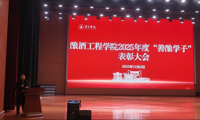 为深入贯彻落实立德树人根本任务,充分发挥先进典型的示范引领作用,激发广大学生刻苦学习、奋发向上的积极性,酿酒工程学院于2025年12月2日在学校大礼堂隆重举行2025年度“善酿学子”表彰大会。学院全体成员领导班子、全体辅导员、班主任代表及全体学生齐聚一堂,共同见证优秀学子的荣耀时刻,激励全院学生见贤思齐、追求卓越,营造“比学赶超、善酿成才”的优良学风氛围。会议由学院学生工作室主办赵新城主持。