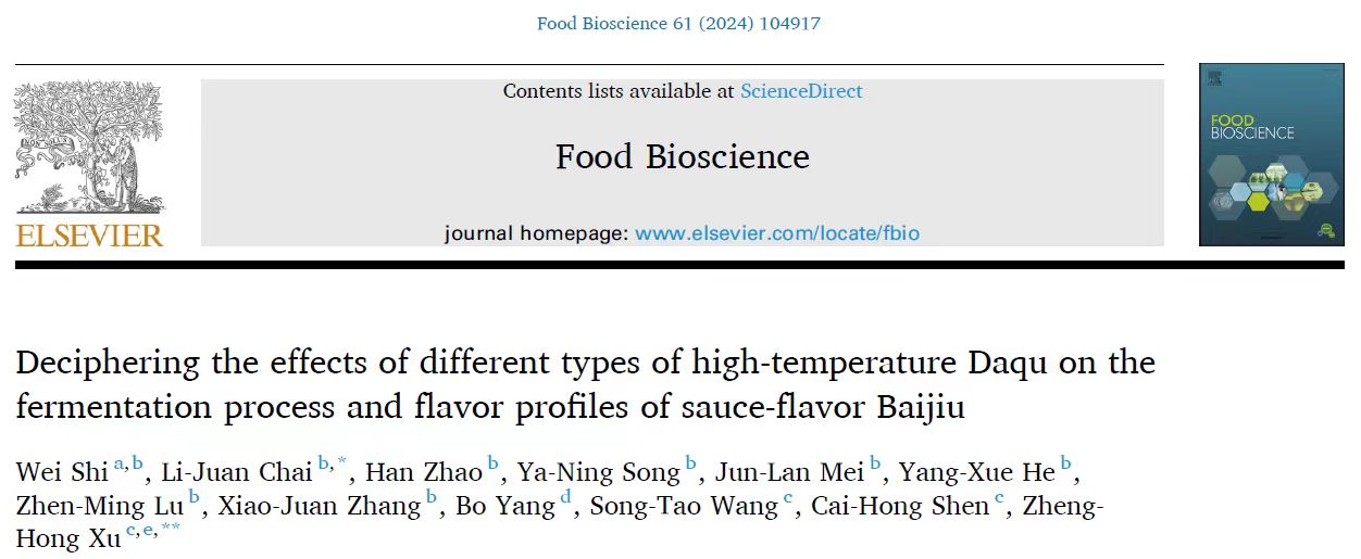 近日,taptap点点体育酿酒工程系绿色酿造技术团队时伟博士(第一作者)在国际知名TOP期刊《Food Bioscience》(IF: 4.671,中国科学院1区)上发表了题为“Deciphering the effects of different types of high-temperature Daqu on the fermentation process and flavor profiles of sauce-flavor Baijiu”的研究论文。
