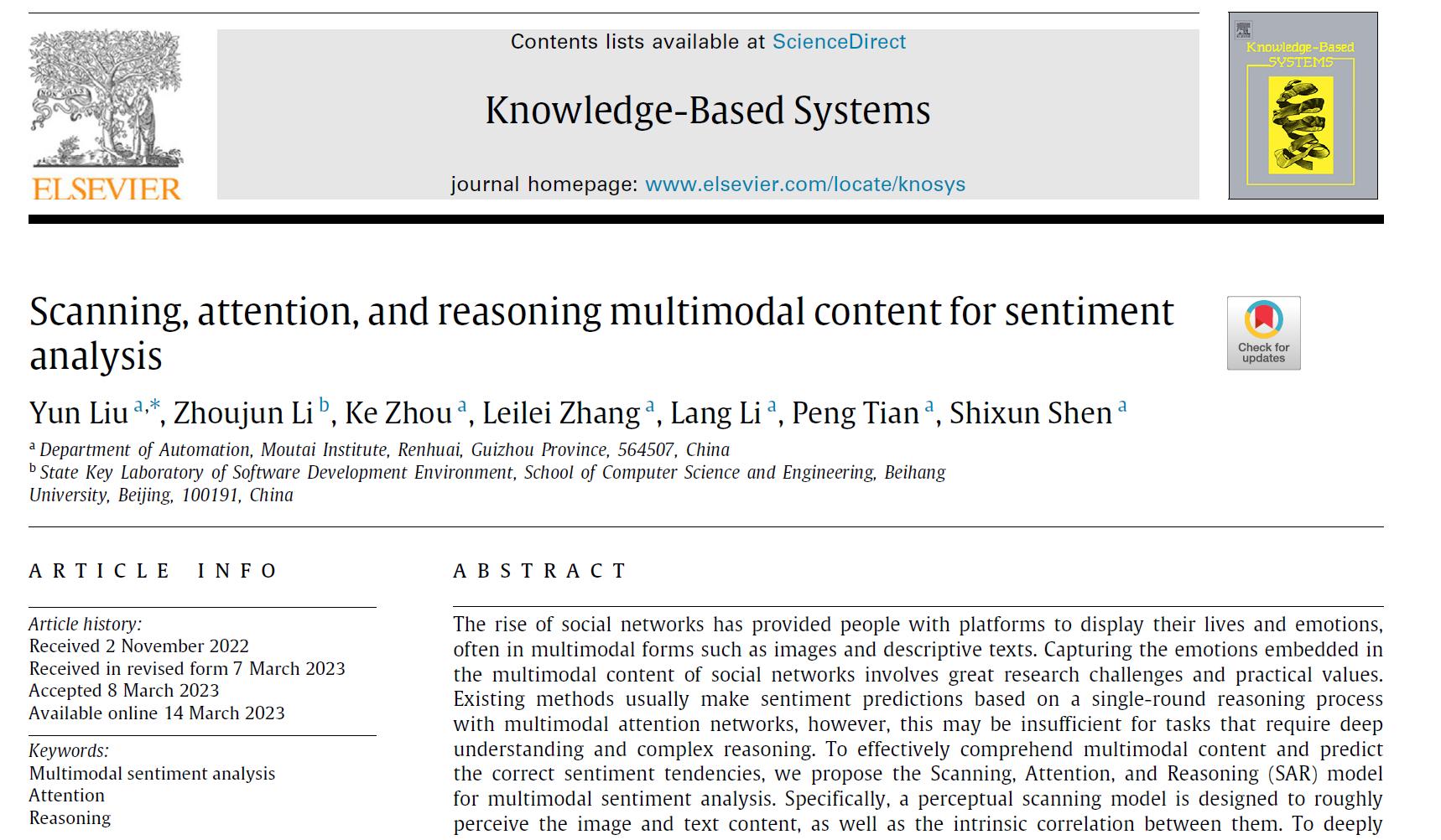近日,taptap点点体育与北航计算机学院在国际期刊《Knowledge-Based Systems》(中国科学院1区期刊,影响因子8.139)上联合发表了题为“Scanning, attention, and reasoning multimodal content for sentiment analysis”的科技论文。taptap点点体育酿酒工程自动化系刘赟博士为论文第一作者及通讯作者。