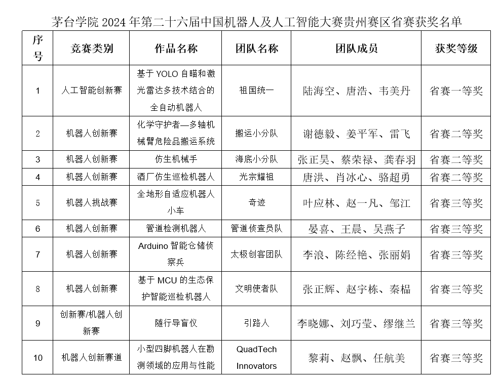 6月23日,第二十六届中国机器人及人工智能大赛贵州赛区省赛圆满落幕。经现场汇报、答辩及展示等环节,点点体育最终斩获一等奖1项、二等奖3项、三等奖6项。其中,“基于YOLO自瞄和激光雷达多技术结合的全自动机器人”“酒厂仿生巡检机器人”“仿生机械手”“化学守护者—多轴机械臂危险品搬运系统”被推荐至国赛。