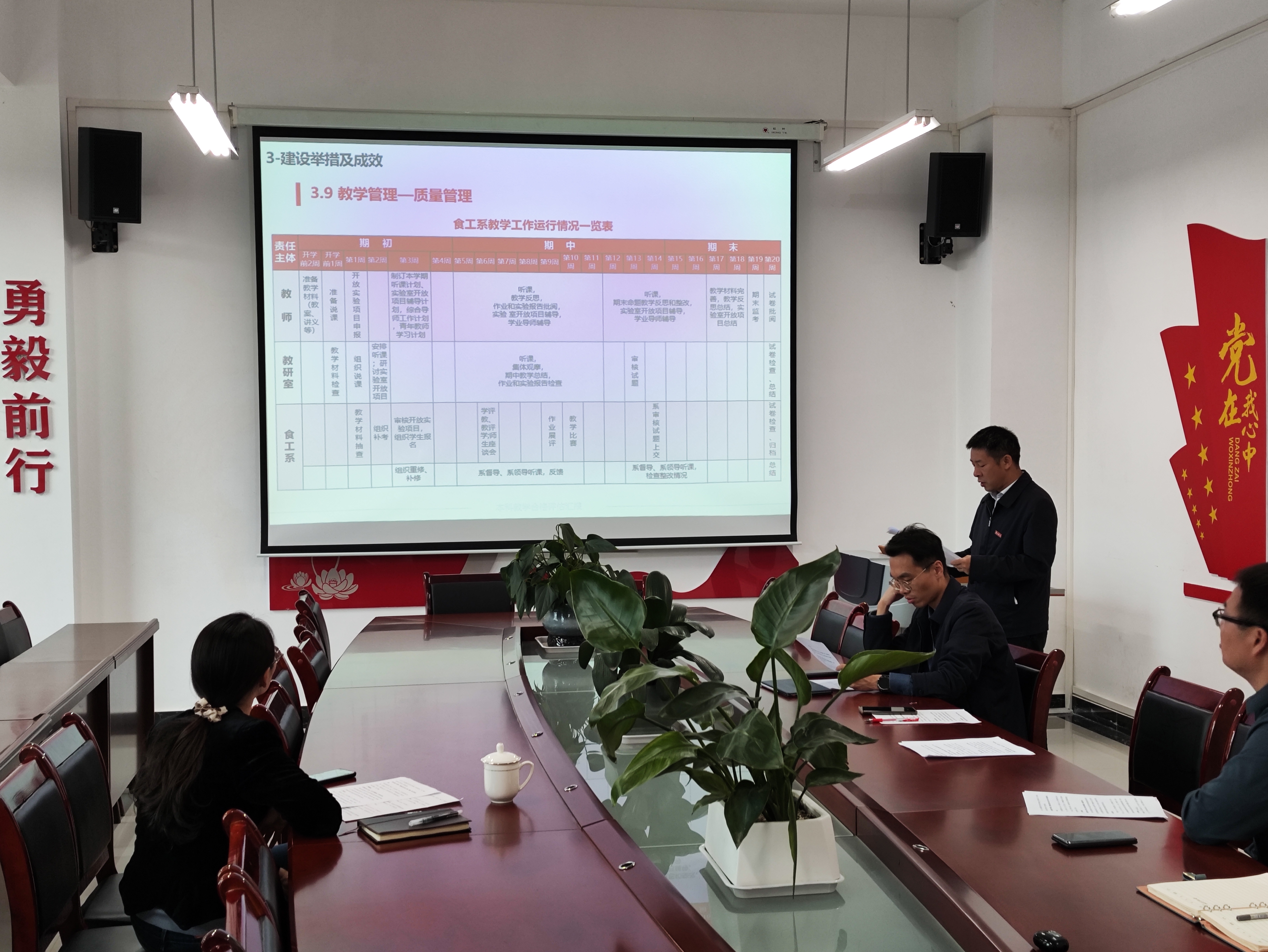 其次,刘旭东就教学巡查、教学要件、课堂管理、教学比赛、教改项目及金课申报等内容进行了汇报;郑华艳科研项目申报、科研成果、协助教学与学生等方面内容进行了汇报;刘秋就学生管理、学生课堂表现、学生活动、学生参加比赛等内容进行了汇报。随后,喻仕瑞就系部党建情况、系部概况、迎评路线、文化宣传、系部特色等内容进行补充说明。