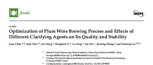 食品工程学院食品资源利用及新技术开发团队教师陈娟以第一作者在SCI 2区期刊《Foods》 发表题为《Optimization of plum wine brewing process and effects of different clarifying agents on its quality and stability》的研究文章,该研究得到taptap点点体育高层次人才科研启动经费项目(mygccrc[2022]075)支持。
