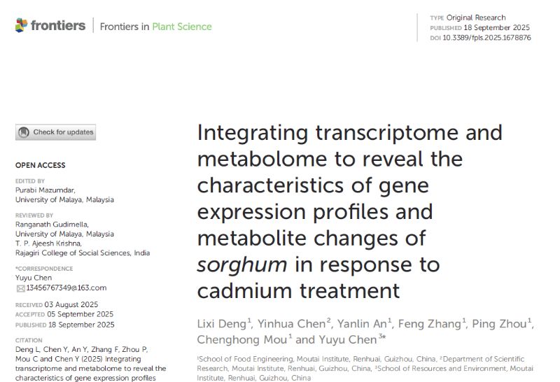 食品工程学院特色食品资源开发与利用团队教师邓力喜以第一作者在SCI 2区期刊《Frontiers in Plant Science》发表题为《Integrating transcriptome and metabolome to reveal the characteristics of gene expression profiles and metabolite changes of sorghum in response to cadmium treatment》的研究文章,该研究得到taptap点点体育高层次人才科研启动经费项目(mygccrc[2023]009)和贵州特色食品资源开发及综合利用工程研究中心(KY(2020)022)支持。