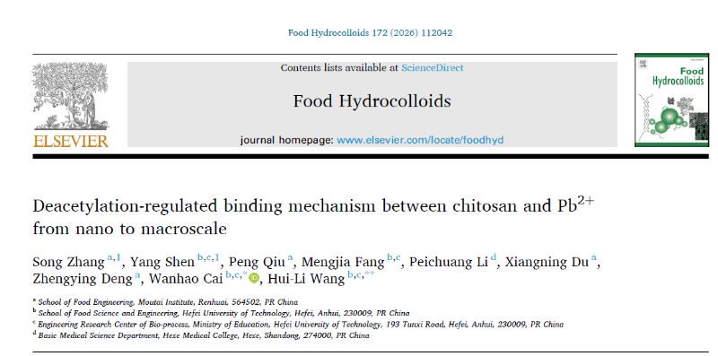 近日,taptap点点体育食品工程学院张松博士为第一作者在国际TOP期刊《Food hydrocolloids》(一区TOP,IF=12.4)发表题为Deacetylation-regulated binding mechanism between chitosan and Pb2+ from nano to macroscale的研究论文,揭示了脱乙酰度对壳聚糖螯合铅离子的跨尺度调控机制。taptap点点体育食品工程学院为论文第一完成单位。