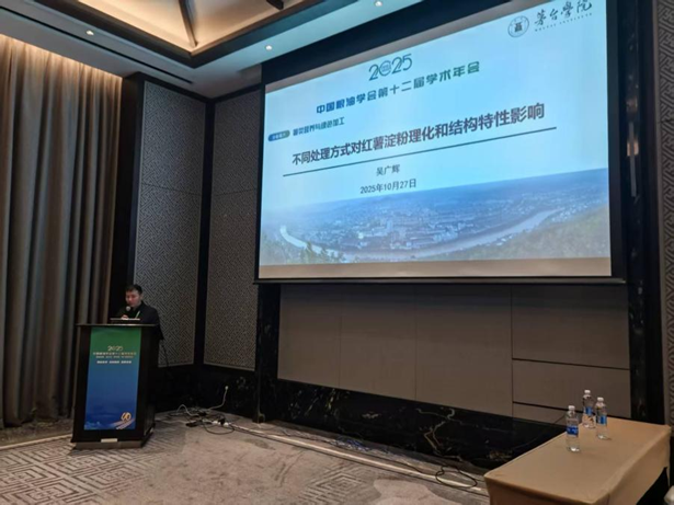 2025年10月25日至27日,中国粮油学会第十二届学术年会在江苏无锡举办。会议由中国粮油学会与江南大学主办,聚焦粮食领域科研进展、技术创新及产业高质量发展,设开幕式、院士论坛、10个分会场及成果展览等板块,会议吸引全国近1000位专家、学者及企业代表参加。食品工程学院食品科学系主任吴广辉教授应邀参加会议,并在“分会场六 薯类营养与绿色加工”作题为“不同处理方式对红薯淀粉理化和结构特性影响”的专题报告,并向有关专家交流了食品科学与工程专业建设、食品科学相关学术问题。