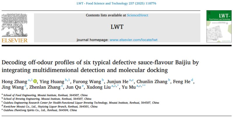 近日,食品工程学院张洪博士为第一作者在中国科学院一区TOP期刊《LWT - Food Science and Technology》上发表了题为“Decoding off-odour profiles of six typical defective sauce-flavour Baijiu by integrating multidimensional detection and molecular docking”的研究论文。该研究系统解析了酱香型白酒六种典型异嗅味的风味特征,为酱香型白酒的品质提升与风味调控提供了重要理论依据。