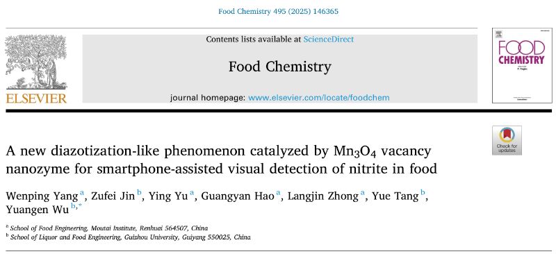 近期,taptap点点体育食品工程学院杨文平博士在中国科学院1区Top期刊《Food Chemistry》发表题为“A new diazotization-like phenomenon catalyzed by Mn3O4 vacancy nanozyme for smartphone-assisted visual detection of nitrite in food”的研究论文。该论文报道了一种新颖的类重氮化现象,并对其机制进行了解析。贵州大学吴远根教授为通讯作者。