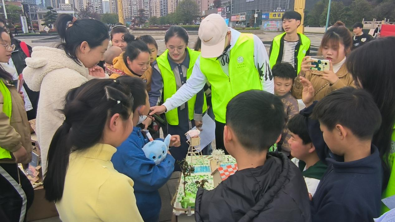 主持人对“创意无限·美丽中国”旧物资源回收创意设计大赛获奖作品进行介绍,并由一等奖获得者王盼东同学对他的作品进行详细的讲解。他围绕作品的创意构思、原材料采集、制作过程、应用场景等各个环节进行了生动详细地介绍,并邀请小朋友们分享所观察到作品的材料及构成。