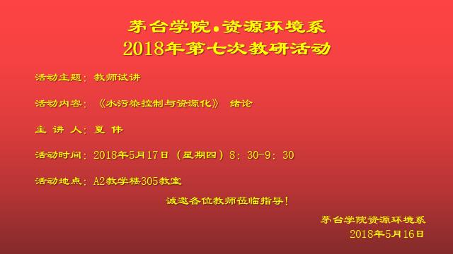2018年5月17日,资源环境系夏伟老师,试讲了课程《水污染控制与资源化》 绪论部分,课件背景优美、字体大小合适、排版合理。讲课过程中课件与课本联系,有机结合、相互补充。 讲课吐字清晰标准,语速合适。整个过程一气呵成,能圆满完成此次试讲计划。