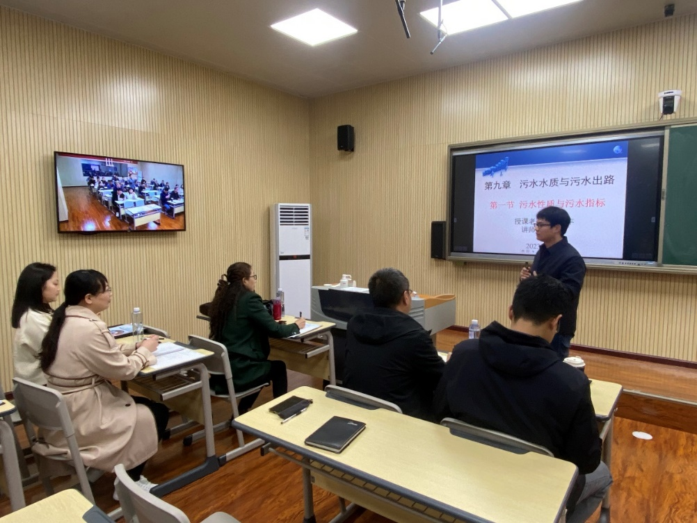 活动中,国赛主讲教师李怡以《水污染控制工程》课程中“消毒法”部分为授课内容,开展了45分钟完整的示范课教学。李老师优雅大方的教态、逻辑严密的教学设计、精彩丰富的课程素材、构思巧妙的思政元素给全体教师们留下了深刻的印象。