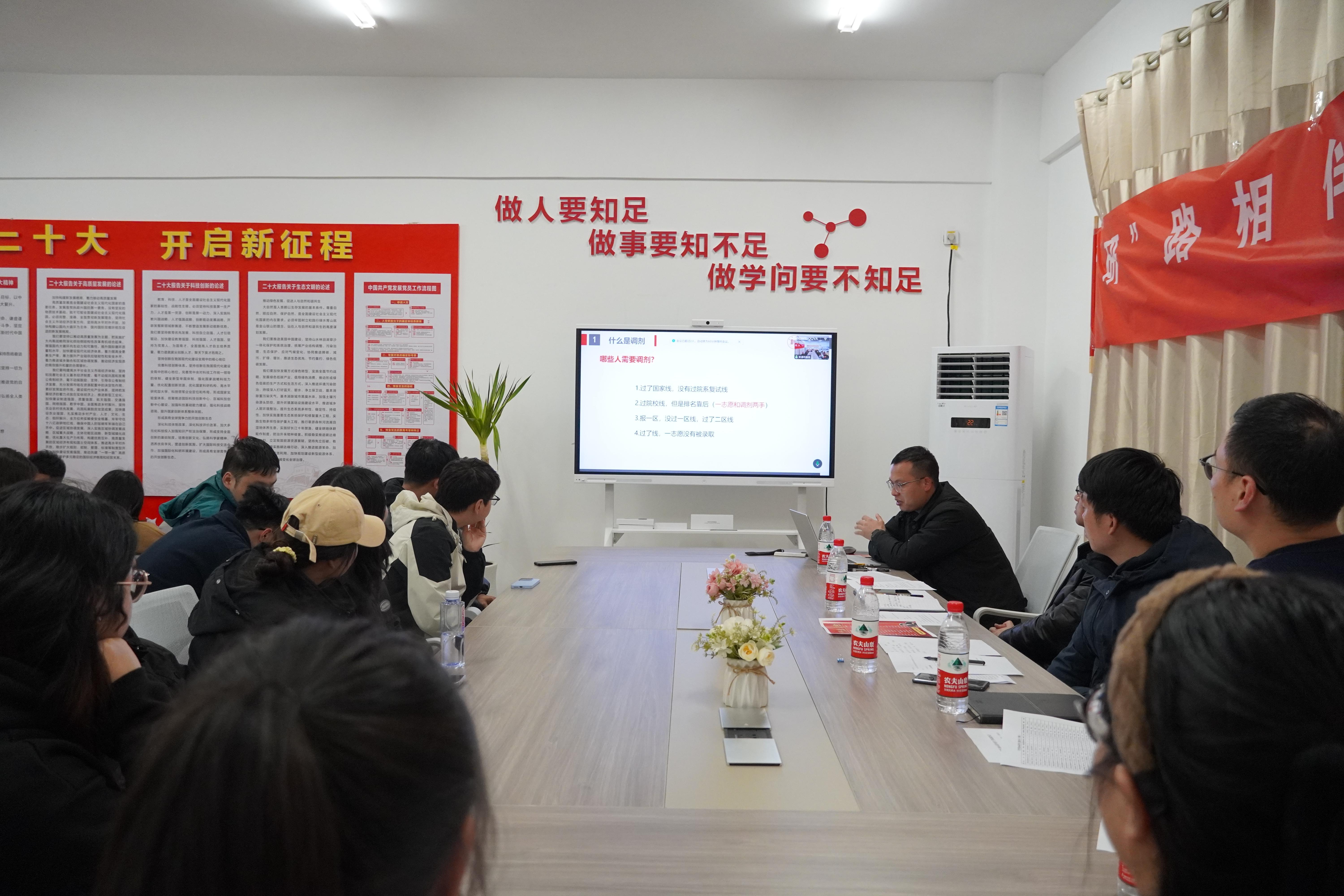 冯华仲老师肯定了同学们前期为考研所付出的努力,勉励学生们坚定信心、沉着应对,总结经历优势,关注官方信息,积极与老师沟通,做足做好面试和调剂准备。何兴华老师做了考研面试主题培训。他从考研面试的各个环节入手,详细地介绍了面试的流程、需要准备的材料,重点就如何与导师有效沟通、如何制作个人简历、如何在面试中做好自我介绍等关键环节进行了分析。杨应增老师做了考研调剂主题培训。他详细介绍了研究生调剂政策和流程,提示同学们需要密切关注学校的调剂政策、具体要求和时间节点,及时准备相关材料;要积极主动沟通,尽最大努力争取调剂机会。