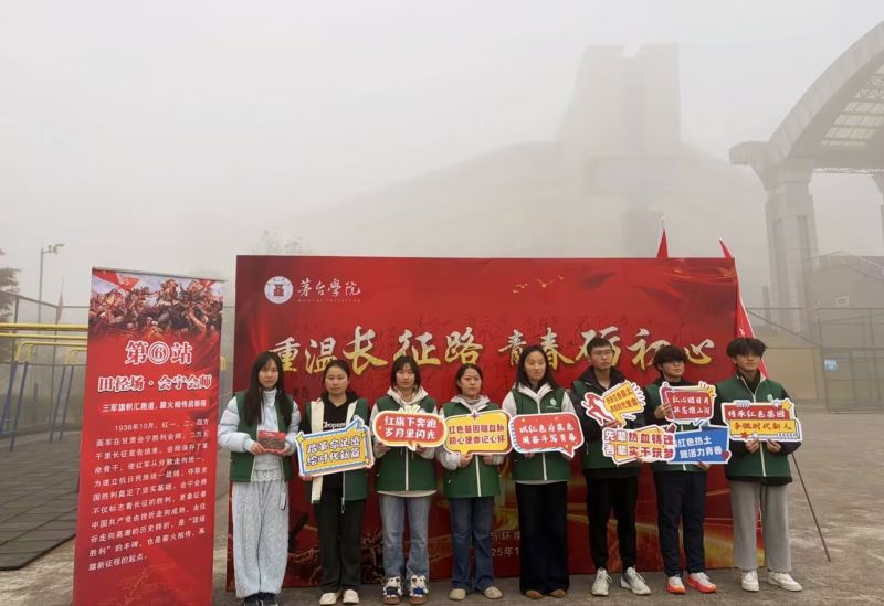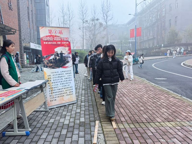 晨光奔跑:校园化作“微型长征”,路线依序铺展瑞金、乌江、遵义、赤水、泸定、会宁六站。师生一路从“瑞金”(图书馆)浩荡出发,在“强渡乌江”(初心路)写下人生誓言,在“遵义会议”(大礼堂)听转折故事,在“四渡赤水”(宿舍楼)模拟过浮桥,在“飞夺泸定桥”(专家楼)高唱红歌,最后抵达“会宁”(田径场)共话励志感悟。参与人员纷纷在每个站点集印章、留签名、说体会、表决心。脚步替理想测距,印章为坚持留痕——六枚红印连成信仰坐标,提示下一段征程:跑下去,终会迎来新的胜利。