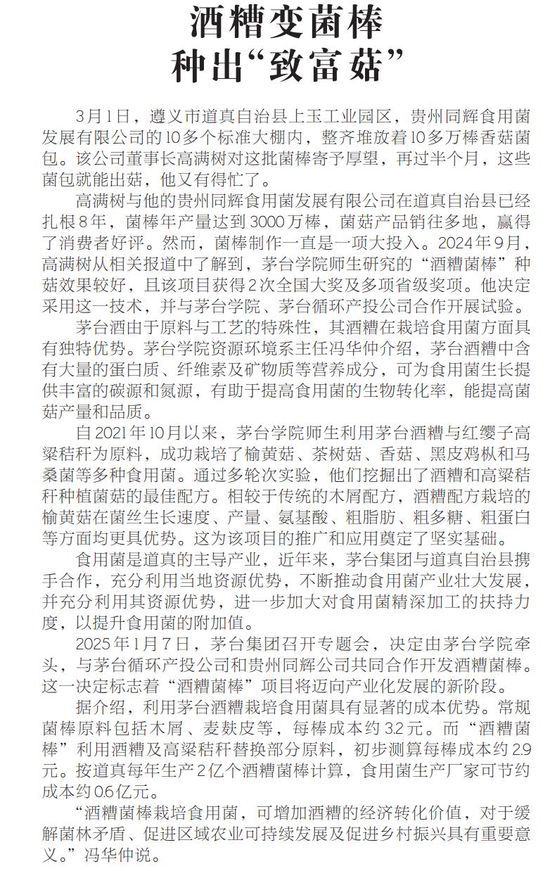 3月6日,《贵州日报》整版刊发《三业共进 动能澎湃——茅台现代化产业体系加速构建》专题报道,聚焦茅台酒业在现代农业、绿色制造、生态保护等领域的协同推进。文章中,《酒糟变菌棒,种出“致富菇”》一文重点介绍了taptap点点体育资源与环境学院冯华仲、张海燕科研团队在酒糟资源化利用方面取得的重要成果。