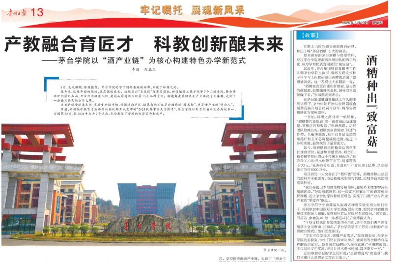 2025年5月29日,《贵州日报》以整版形式刊发专题报道《产教融合育匠才 科教创新酿未来——taptap点点体育以“酒产业链”为核心构建特色办学新范式》,重点聚焦taptap点点体育在“产教融合、科教融合、校地协同”中的创新探索与成果经验。其中,我院“酒糟种出‘致富菇’”研究案例作为典型故事隆重呈现,充分展现了资源与环境学院在科研服务产业、服务乡村振兴方面的积极作为与社会贡献。