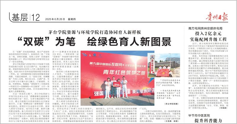 此次报道是对学院育人机制改革实践的充分肯定,进一步彰显了学院在“双碳”战略背景下服务地方、引领改革的责任担当。资源与环境学院将继续坚持“服务国家战略、对接区域发展”定位,扎根赤水河流域,做实绿色育人,不断探索地方高校高质量发展的新路径。