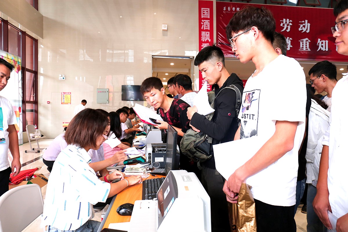 大礼堂门廊内人头攒动,却又井然有序。酿酒工程、葡萄与葡萄酒工程、市场营销、食品科学与工程等12个本科专业齐招生,00后们带着激动与新奇排队办理注册报到、一卡通激活等各种入学手续,计划财务处财以及各个系部正紧张有序开展工作。