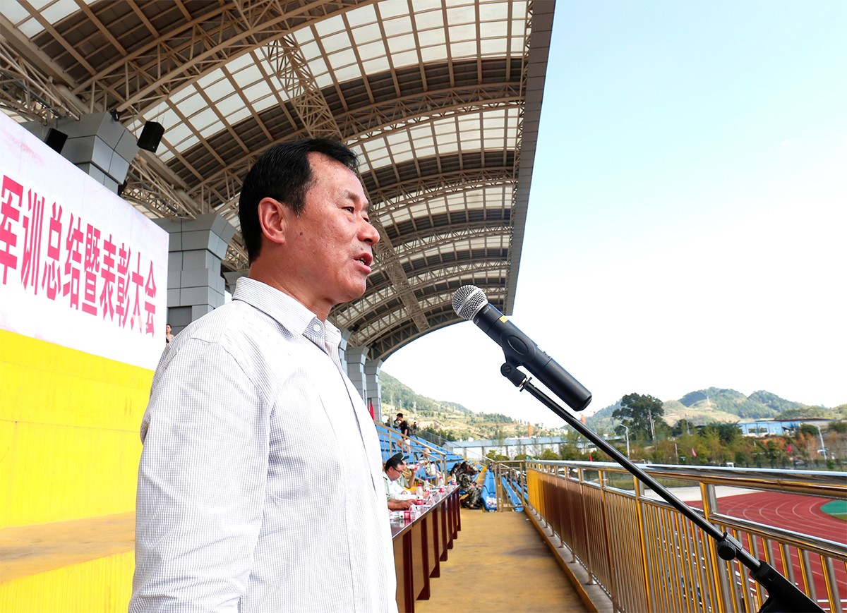 军训汇报表演结束后,军训团政委李增驰对本次军训作了总结讲话。李增驰代表全体参训教官向圆满完成军训任务的老师和同学们表示热烈的祝贺。他在讲话中指出,特长靠自我培养,智力靠自我开发,人格靠自我塑造,身心靠自我磨练。军训虽苦,但它的影响是深远的,希望同学们继续将这宝贵的精神财富发扬光大,不忘初心,继续前进。